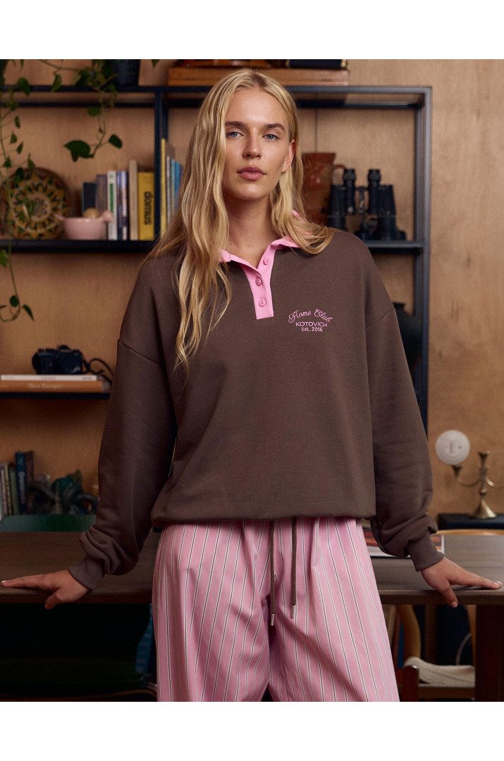 Світшот-поло з рожевим коміром та з рожевою вишивкою "Home Club". Матеріал: трьохнитка. Склад: 100% бавовна. Колір: шоколадний