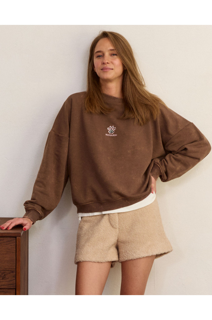Світшот з вишивкою, вільного крою, виварений. Склад: 100% бавовна, матеріал трьохнитка. Після виварювання кожен світшот має свій унікальний малюнок. Колір: шоколадний
